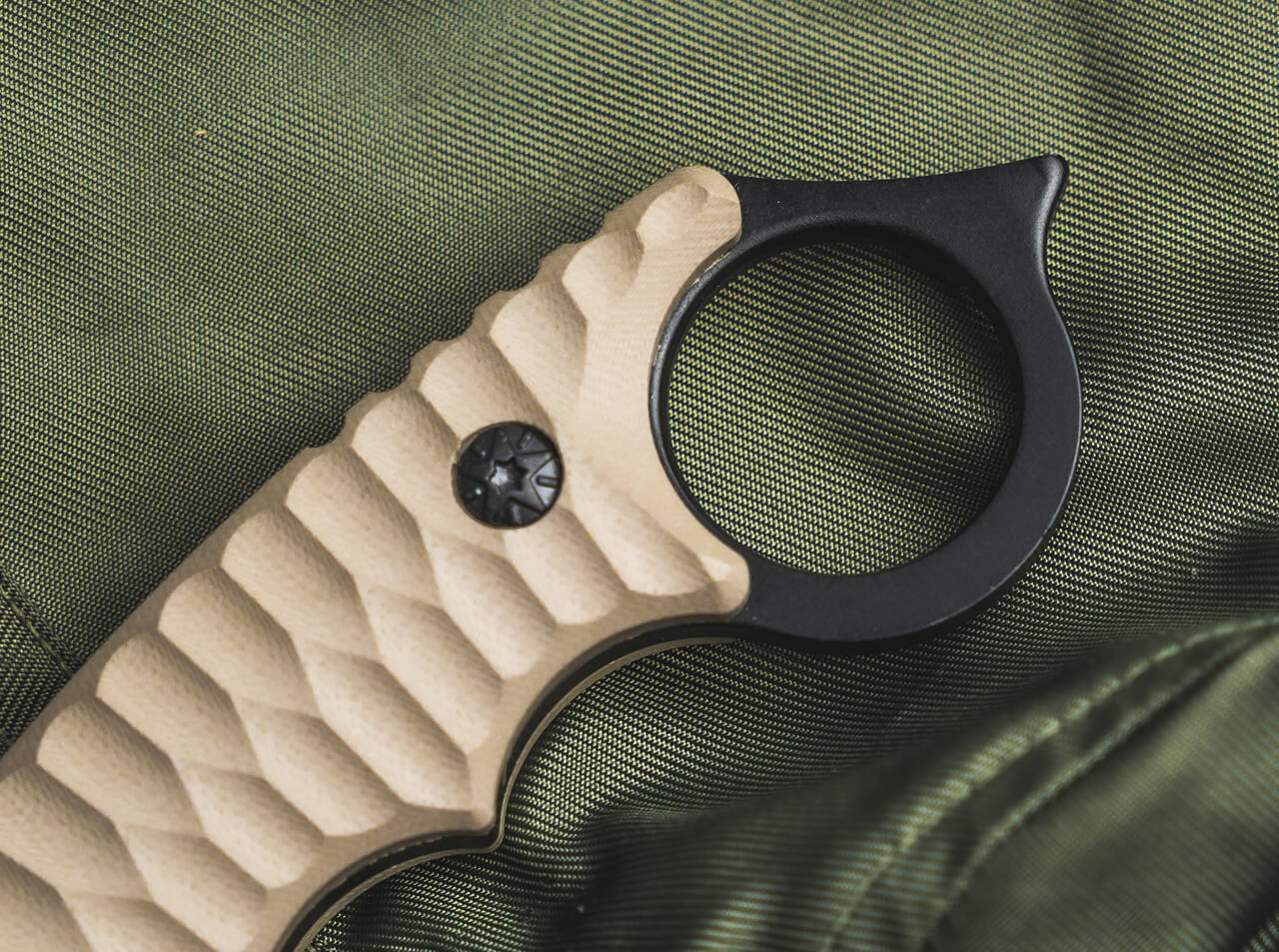 Drška je izrađena od G10 materijala u desert tan boji i ergonomski je oblikovana za siguran hvat. Karakteristični prsten na kraju drške dodatno naglašava karambit koncept, dok integrisani šiljak ovom modelu daje još agresivniji i prepoznatljiviji vizuelni identitet.